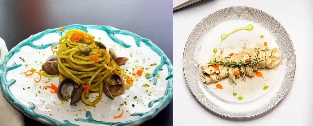 Pasta seperti spaghetti atau fettuccine digulung dengan rapi di tengah piring, dengan saus yangMinimalis dan dekorasi yang simpel, namun tetap berkelas.